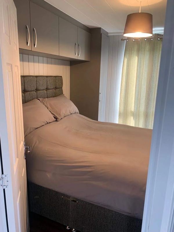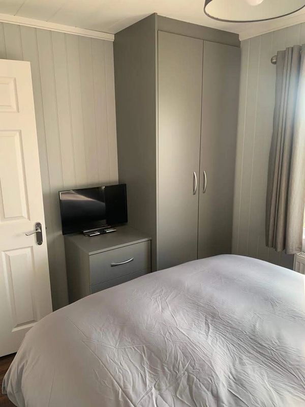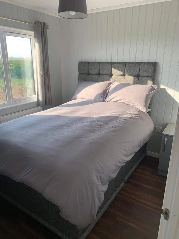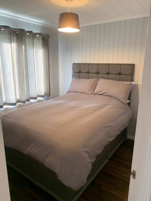 The kitchen is equipped with an oven, microwave, kettle, toaster, fridge freezer and tableware.